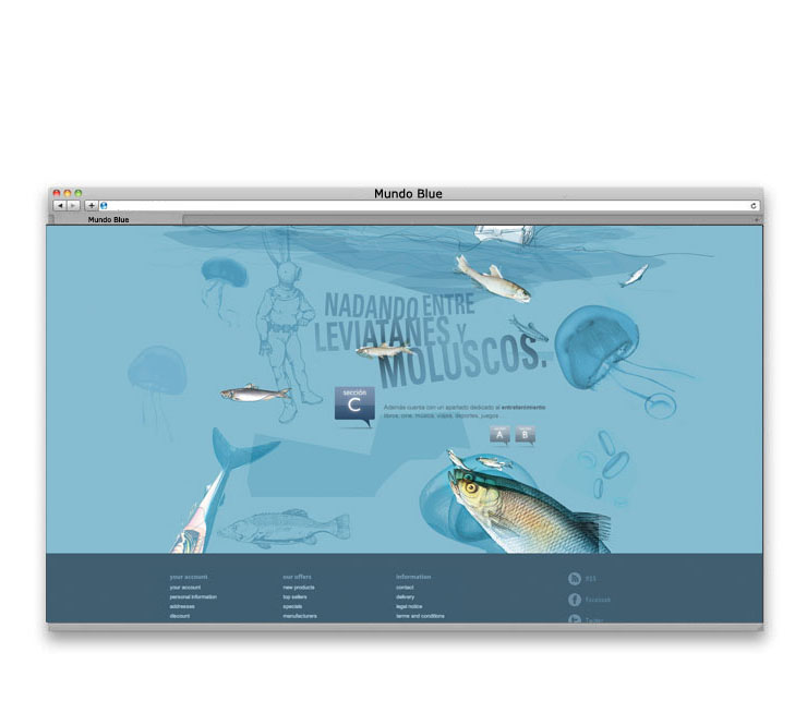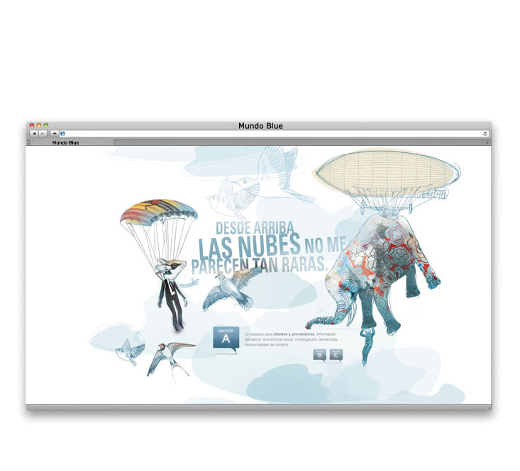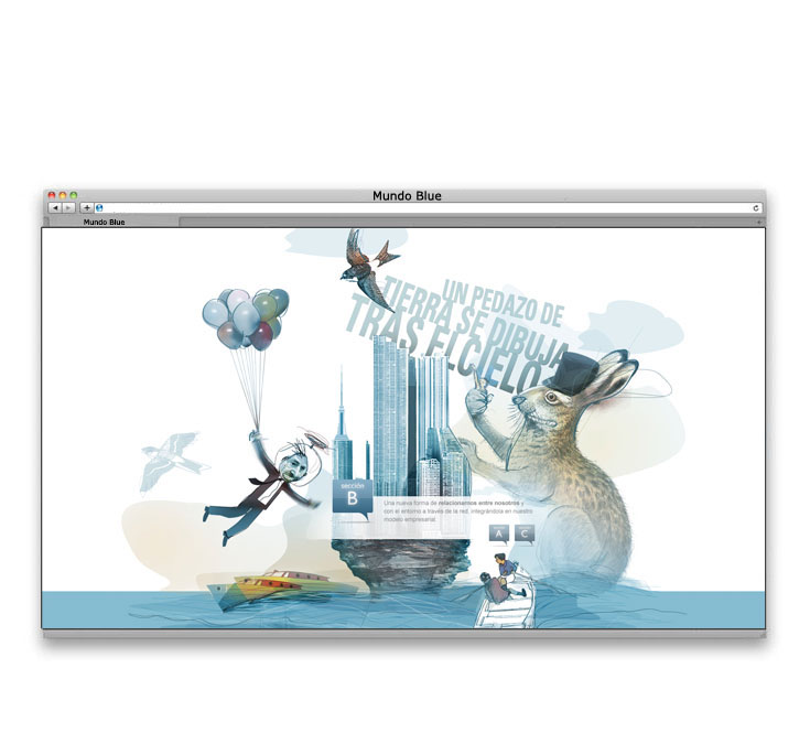— Diseño y concepto de la gráfica para la página web de la agencia de publicidad BLUE.. Se creó todo un mundo personalizado para cada una de las secciones de la web. Video introducción para la web