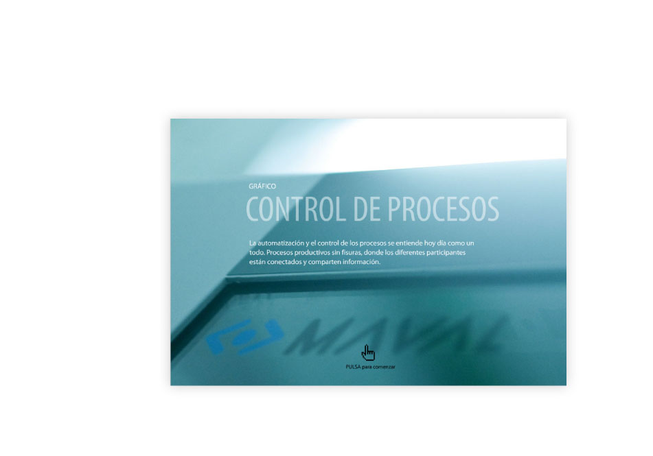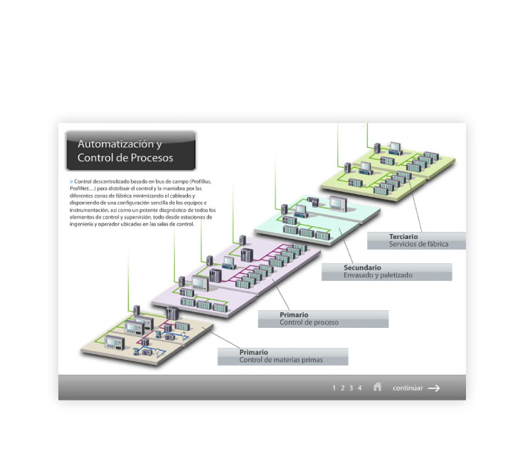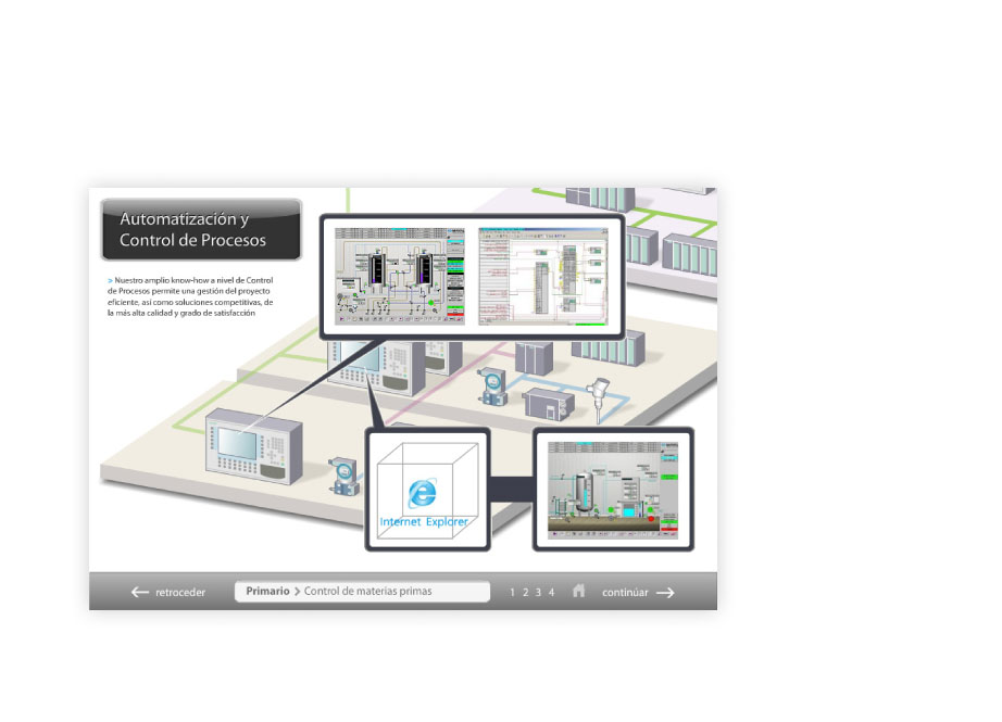 Infografía Interactiva — Diseño y animación gráfico interactivo a través del cual se puede navegar por las distintas fases del Control de Procesos de una planta automatizada.
